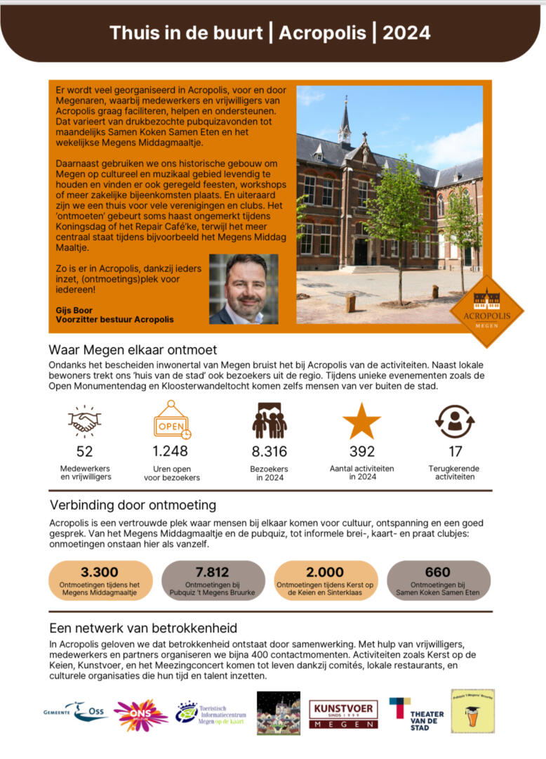 De afgelopen 10 jaar hebben we een sociaal jaarverslag gemaakt. Vanaf dit jaar (2024) is gekozen voor een andere aanpak die zich vooral richt op het laagdrempelig ontmoeten binnen het Sociaal Domein. Dit wordt gestimuleerd vanuit de gemeente Oss.