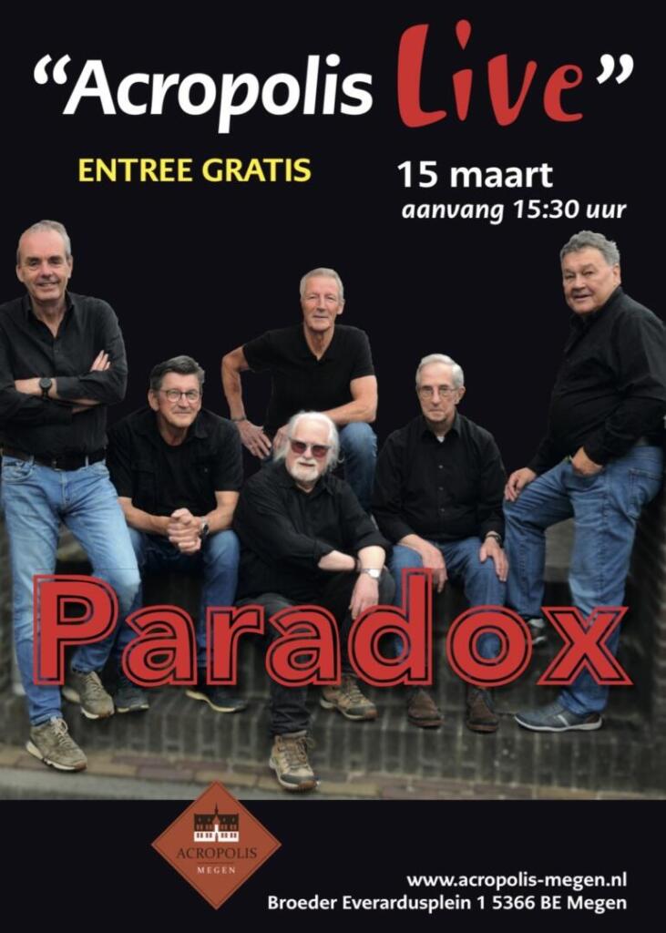 Een gezellige zondagmiddag in Plein1 met de mannen van Paradox. Paradox heeft zijn wortels in Oijen en bestaat al sinds het eind van de jaren zestig, intussen dus zo’n 55 jaar. Er zijn personele wisselingen geweest, maar Paradox is nog steeds Paradox. Dat betekent: goed in het gehoor liggende rockmuziek uit de jaren ’60 en ’70 aangevuld met eigen nummers. Paradox treedt nog geregeld op en deze zondag dus bij Acropolis Live in Megen.