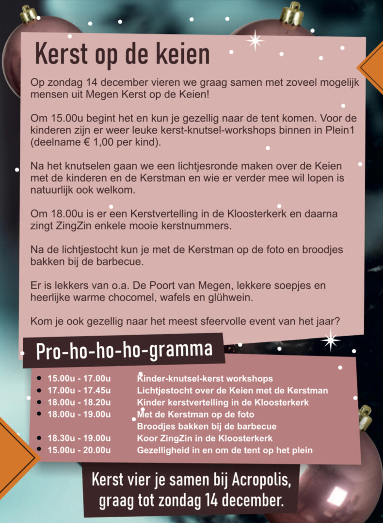Kerst op de KeienHet gezelligste event van het jaar komt er weer aan! We tellen af naar Kerst op de Keien, zondag 14 december. Je komt toch ook? Kerst vier je samen, bij Acropolis.