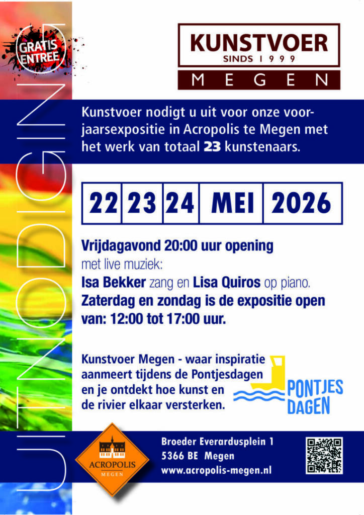 Een weekend vol kunst beleven in het historische Megen? Kom naar de voorjaarsexpositie van Kunstvoer met maar liefst 23 verschillende kunstenaars. De expositie brengt verschillende kunstvormen samen waaronder schilderkunst, fotografie, beeldende kunst, viltkunst, sieraden maken en mixed media. Hiermee krijgt de bezoeker een unieke kans om kennis te maken met uiteenlopende stijlen, perspectieven en technieken. Deze verscheidenheid aan disciplines en invalshoeken maakt deze expositie tot een inspirerende ervaring voor kunstliefhebbers.